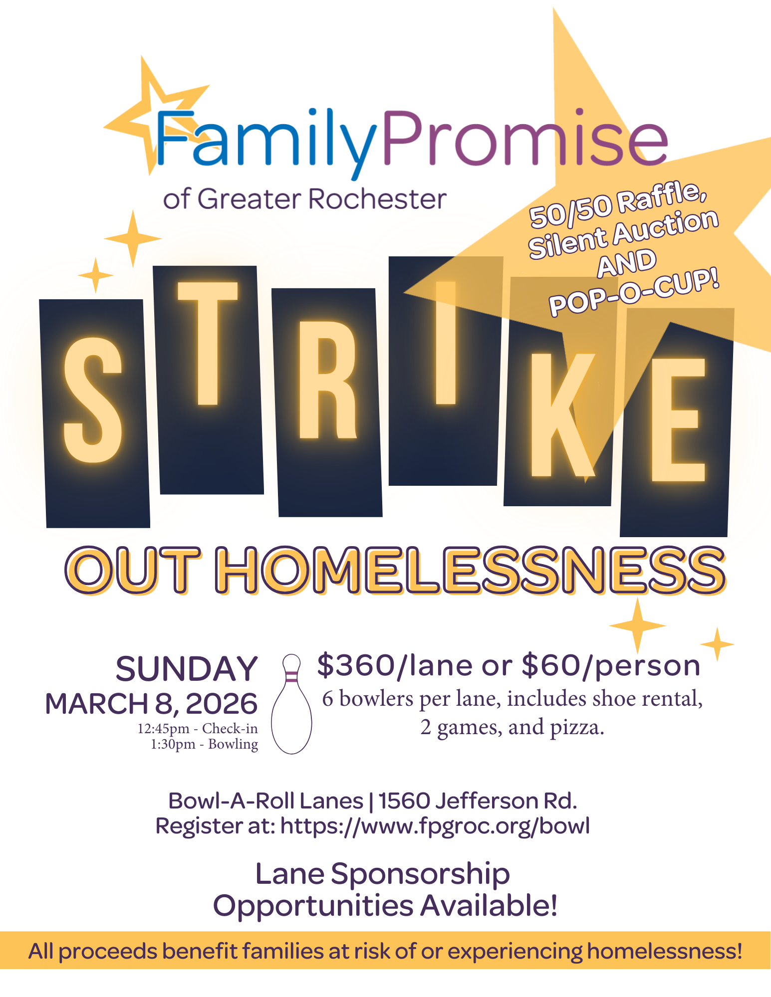 Strike Out Homelessness is a fun event for families and friends to raise funds for Family Promise’s mission to assist families at risk of or experiencing homelessness to achieve sustainable independence by providing person-centered, holistic services in collaboration with the greater community.